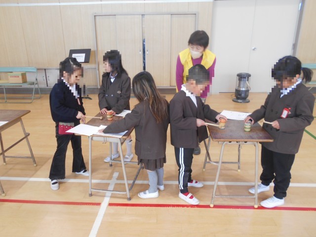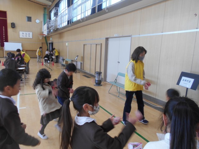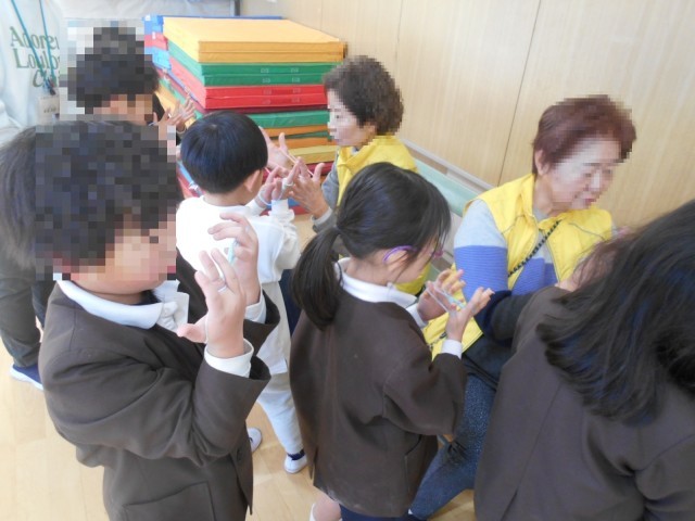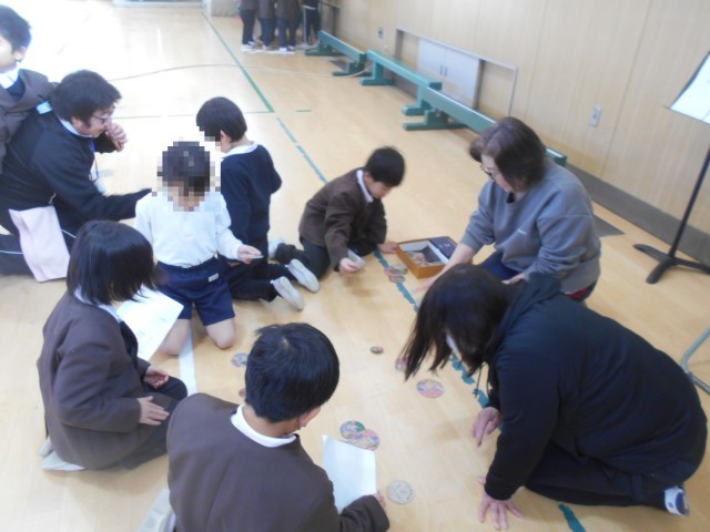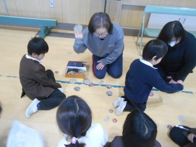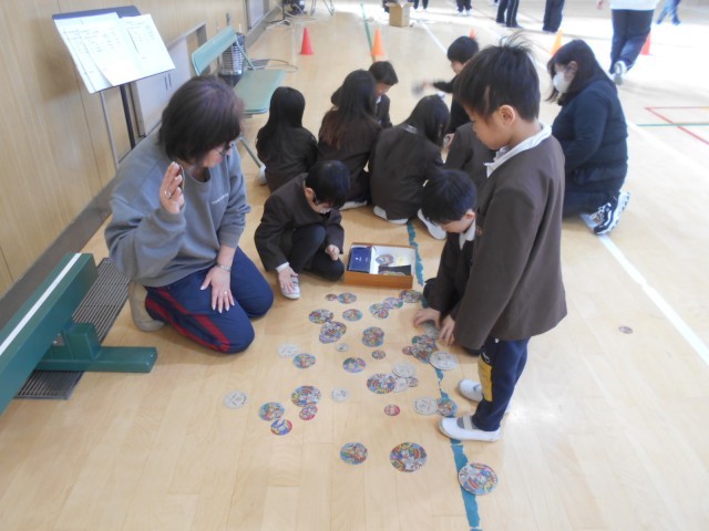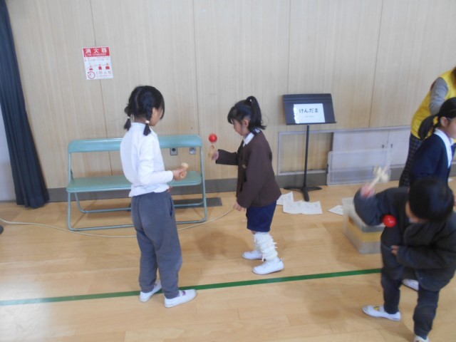 地域の方々、生涯学習の方々にお越しいただき「昔遊び」を体験しました。あやとり、めんこ、こま、けん玉、だるまおとし、お手玉の6ブースをローテーションで回って体験しました。結構上手な子もいました。みんな楽しく活動していました。