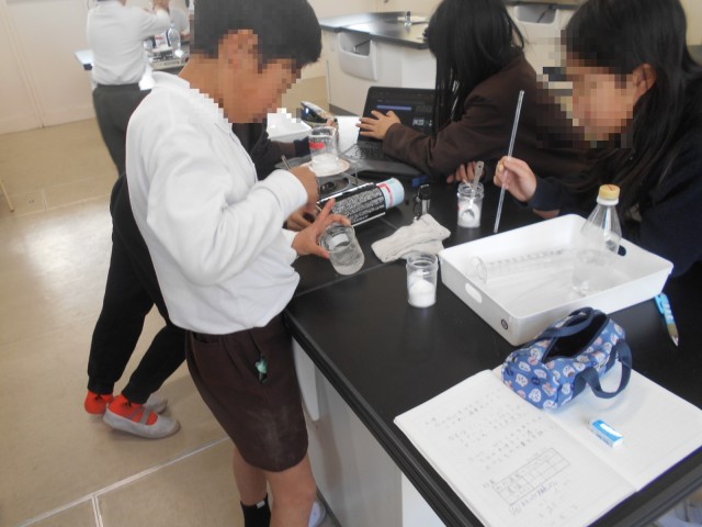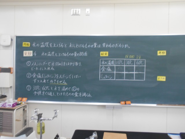 もののとけ方の実験をしました。ミョウバンや食塩を水に溶かしたとき、温度によって溶け方に違いがあるのかを調べました。