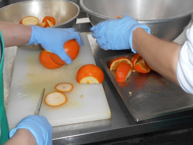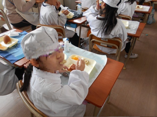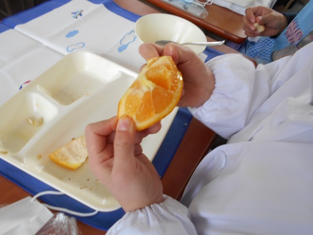 今日のいよかんの産地は愛媛県です。酸味が少なく甘くてジューシーでした。1年生の児童も上手にむいて食べました。
