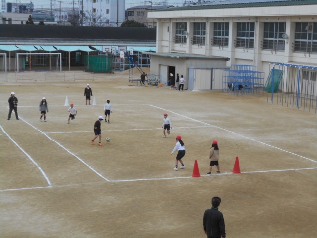 寒い中ではありましたが、運動場で元気に活動していました。サッカーの学習でした。