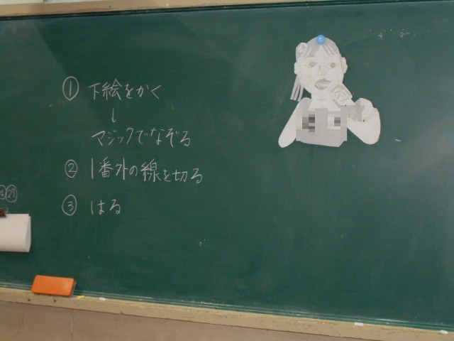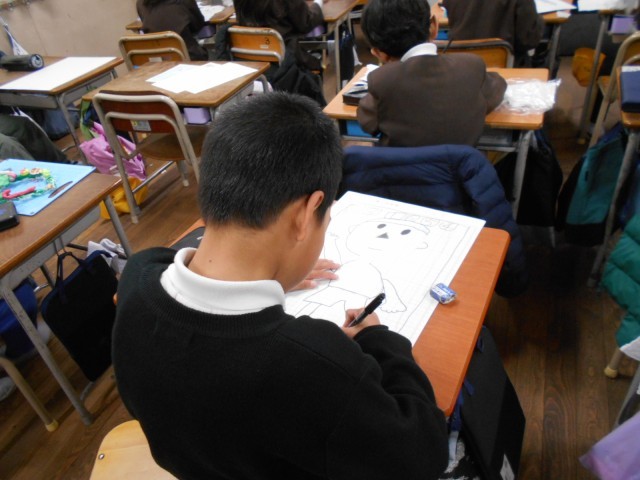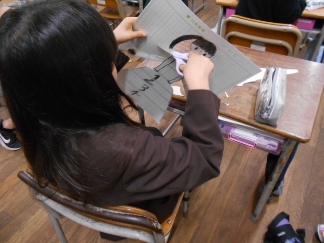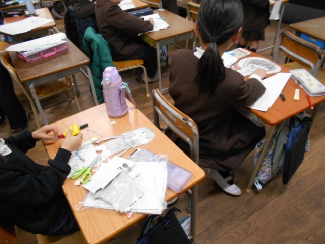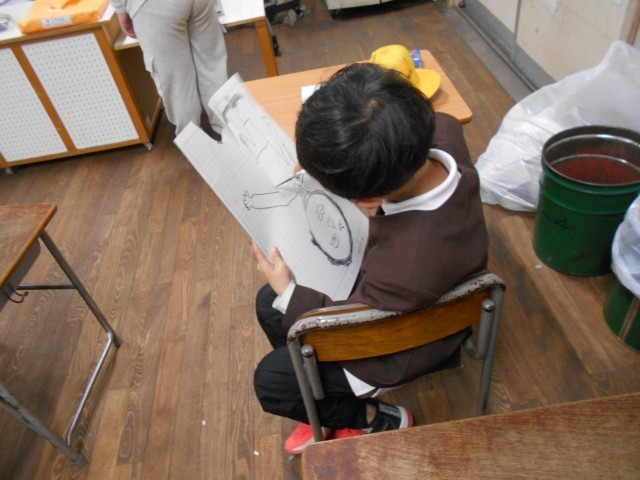 紙版画の版づくりをしていました。工作用紙を使って、絵をかき、マジックでなぞった後、はさみで切り抜きます。版ができるまでが大変です。はやく印刷がしたいですね。