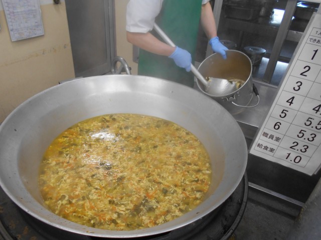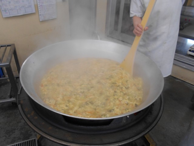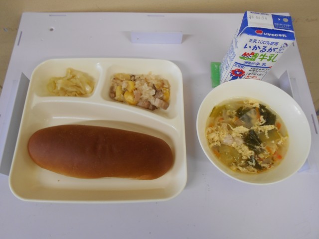 今日は雨が降って少し寒かったですね。卵スープがあったかくてよかったです。中華おこわは、焼き物機で作ります。くりやチャーシューなどの具が入っており、おいしくいただきました。