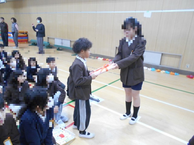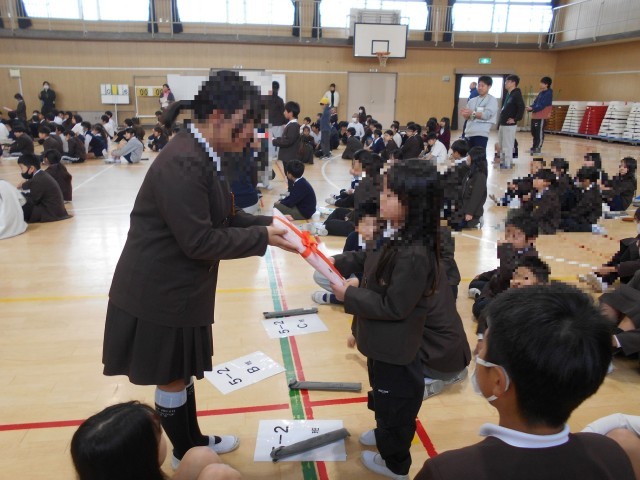 6年生からのお返しのプレゼントをもらいました。代表して班の1年生が受けとりました。