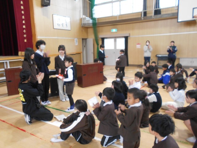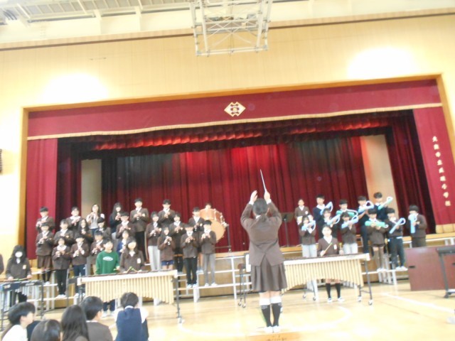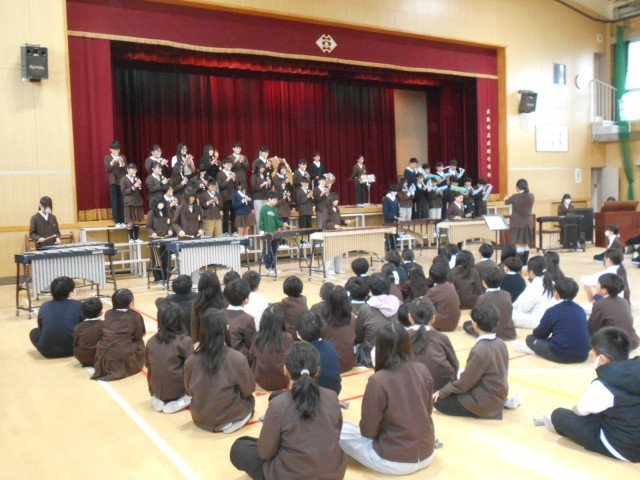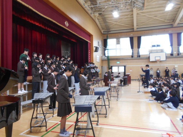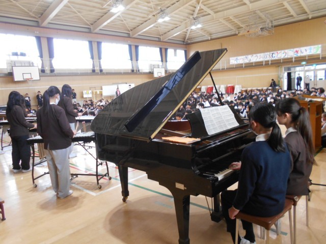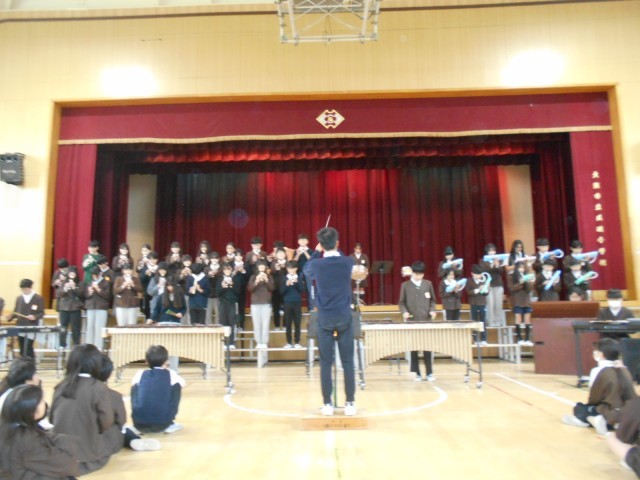 また、ずっと練習してきた合奏「ワタリドリ」「ケセラセラ」の2曲を披露してくれました。在校生はみんな聞き入っていました。