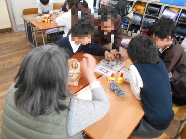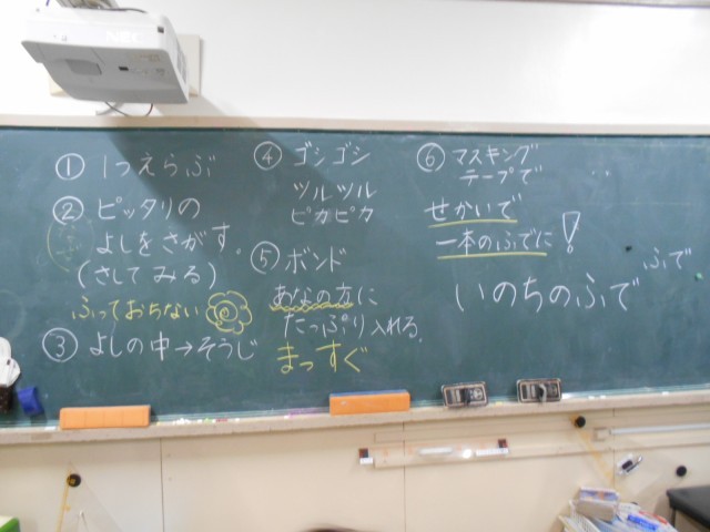 1組は4時間目に体験させていただきました。講師の先生に教えていただいた手順などを、担任の先生が黒板に書いていってくれたので、安心して制作していました。サポートの先生や地域の方もお忙しい中手伝ってくださいました。ありがとうございました。