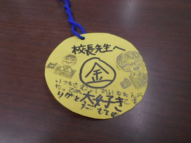 「校長先生、ちょっといい?」と呼び止められました。なんだろう?と思ってたら、「はい」といって画用紙で作った金メダルを首にかけてくれました。とっても嬉しかったです。「ありがとう!!」