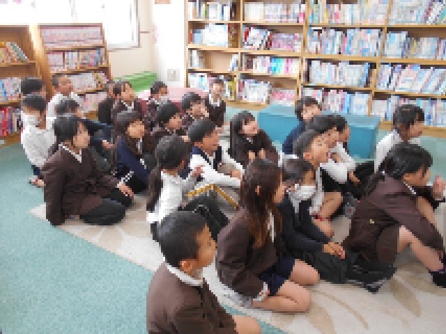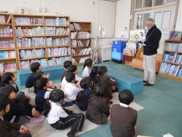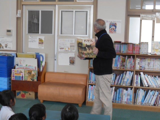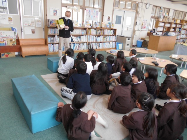 図書室で学校司書の先生に読み聞かせをしてもらいました。「タンゲくん」というお話と「バナナ事件」というお話の2冊を読んでくれました。みんな静かに聞き入っていました。
