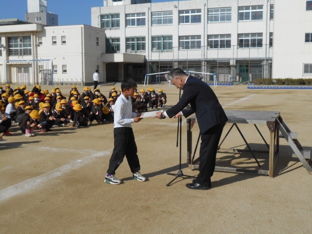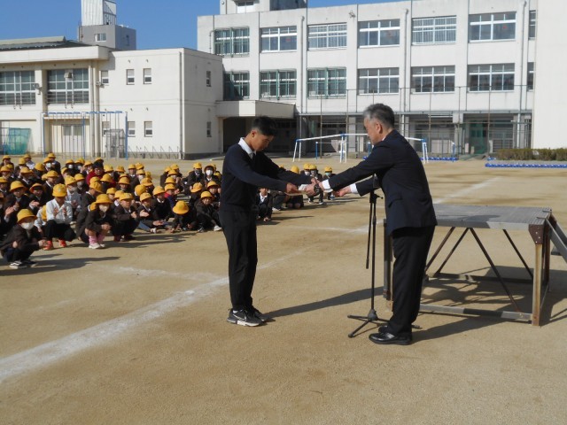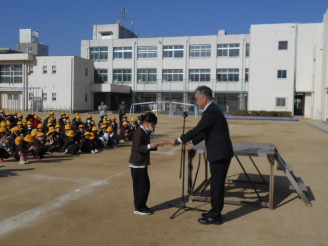 まずは読書ノート達成者についての表彰でした。平野区では児童に「ひらちゃん読書ノート」が配られ、読書の記録を各自で書き込んでいます。目安の冊数に到達できたら、区長から表彰をされるのですが、今日は早朝から副区長さんが代理でご来校し表彰してくださいました。瓜破小学校は、達成者74名でしたが、代表して6年生の児童1名に表彰状が手渡されました。残りの児童は、各学級で担任から手渡ししていただきました。