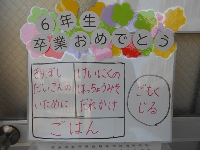 6年生にとって、小学校生活最後の給食となりました。これまでたくさんのメニューをいただいたことと思います。みんな心も身体も大きく成長しました。今日も感謝の気持ちを込めて給食をいただいたことと思います。