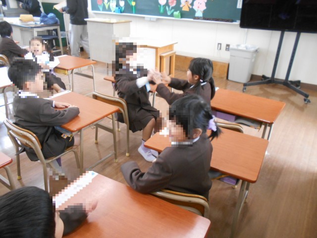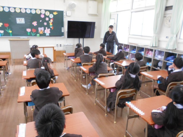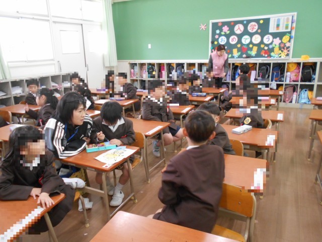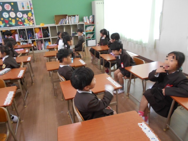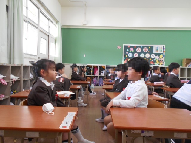 1年生の様子です。お隣さんと向かい合って、自己紹介をしたり質問をしたりしていました。ロッカーの使い方や整理もしました。