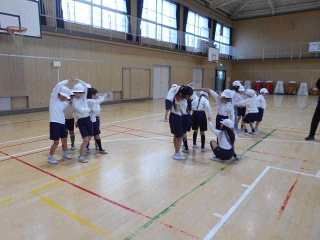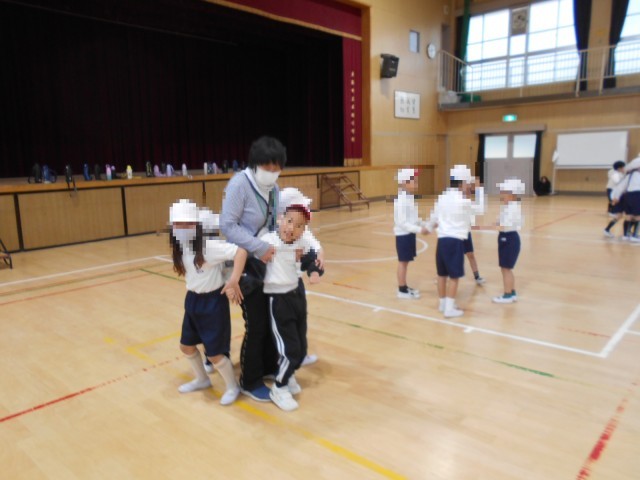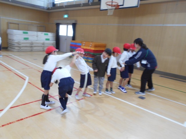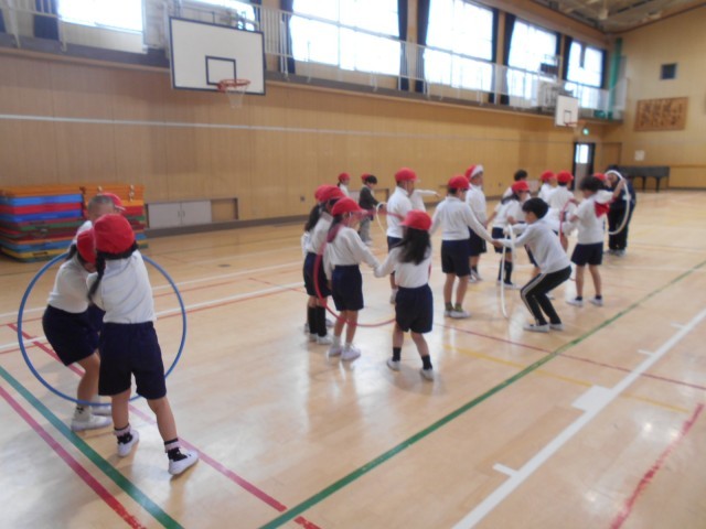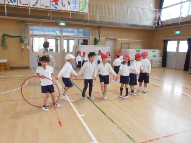体ほぐしの運動に取り組んでいました。フラフープを使った遊びや、「なべなべそこぬけ」の遊びなどを取り入れていました。
