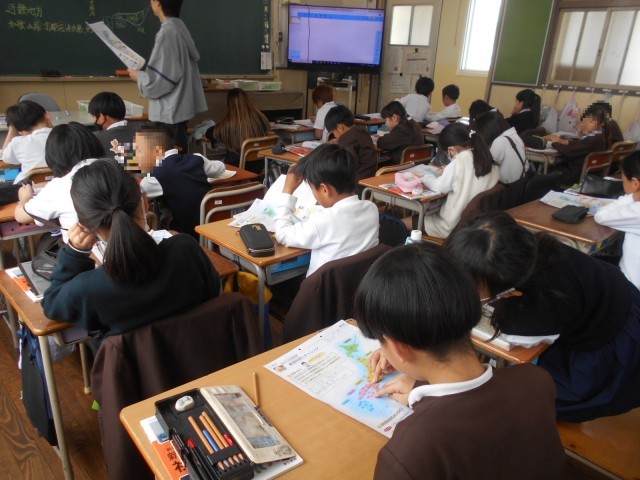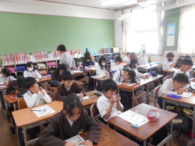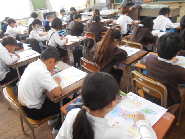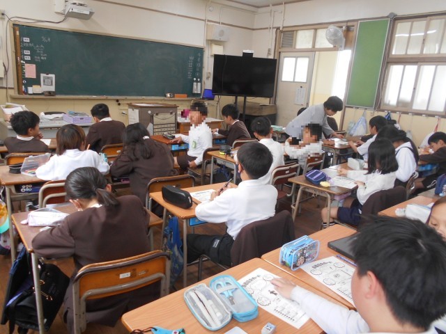 1組では社会科の学習をしていました。地図帳を見て、都道府県の位置を確認していました。元気いっぱいやる気満々でした。2組では、自己紹介カードを作成していました。黙々と作っていました。