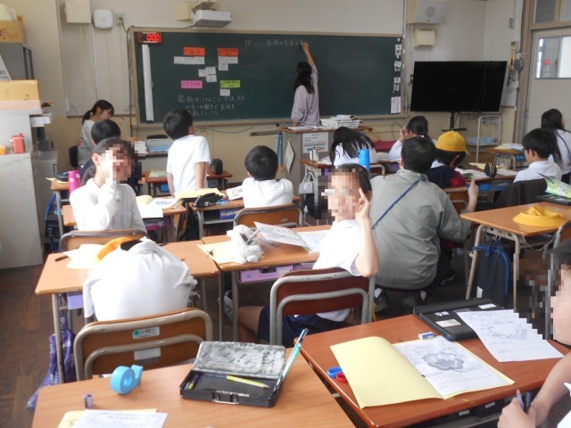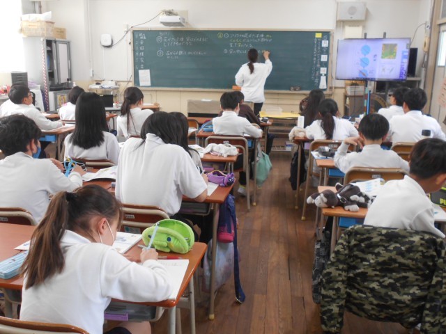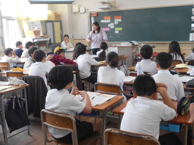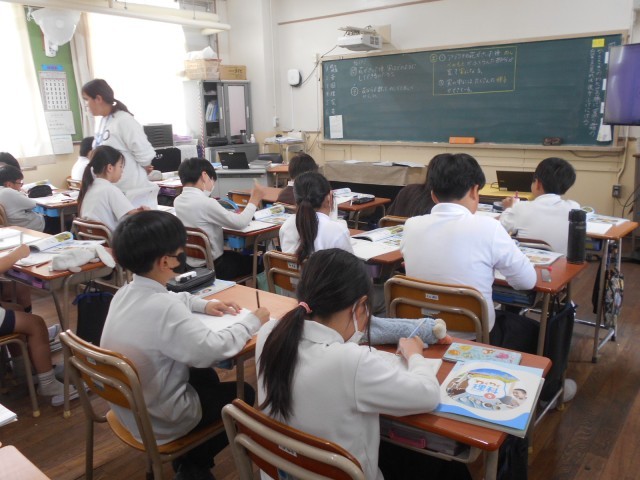 音楽、家庭科、理科は専科の先生が授業をしてくれています。写真はその専科の授業の様子です。2組では家庭科、1組では理科をしている様子を撮影しました。