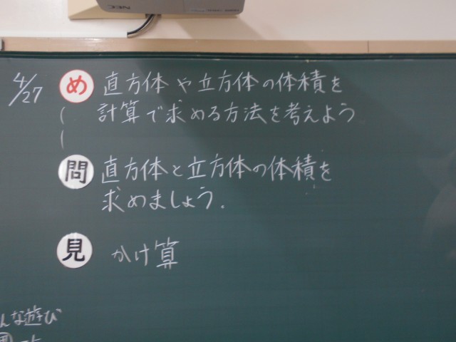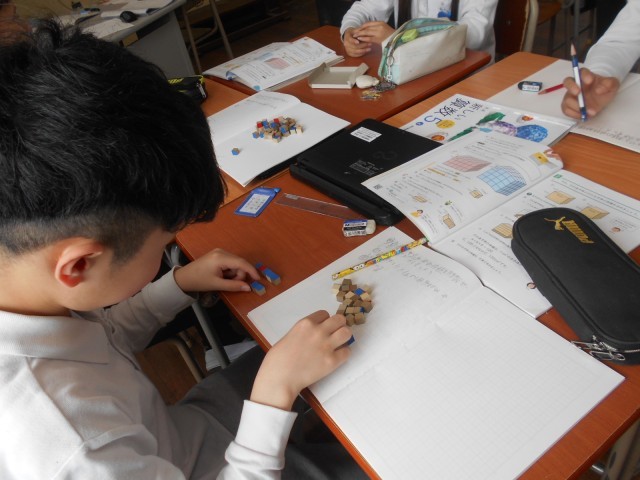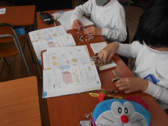 直方体や立方体の体積を計算で求める方法を考えていました。各グループで1㎥の積み木をつかって、考えていました。