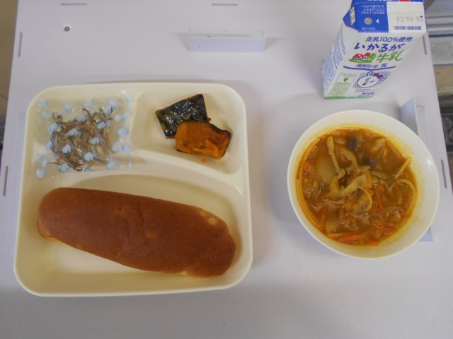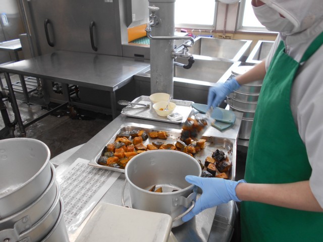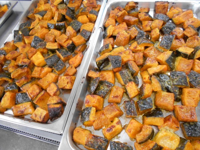 かぼちゃのマリネ焼きは、焼き物機でこんがりと焼き上げます。ノンエッグドレッシングを使用し、アレルギー対応をしています。