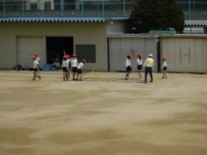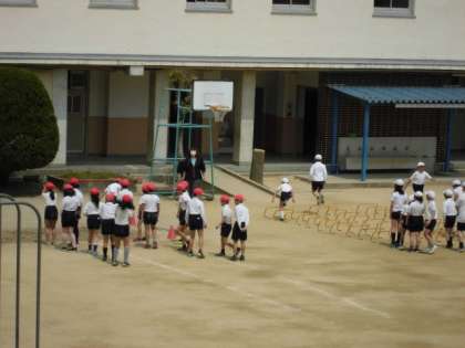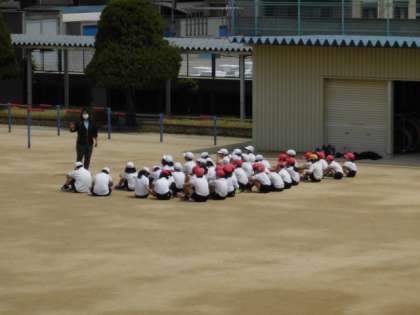 4年生が運動場で、体育の時間に立ち幅跳びの練習をしました。