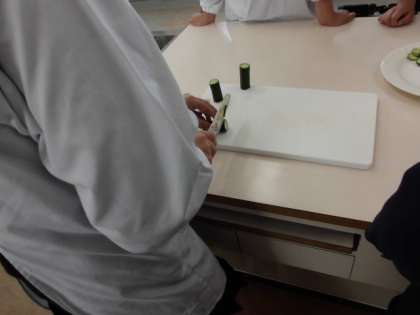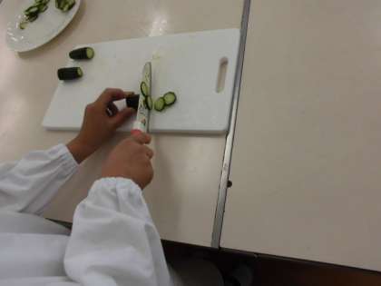 家庭科の時間に包丁を使って、きゅうりをスライスしました。