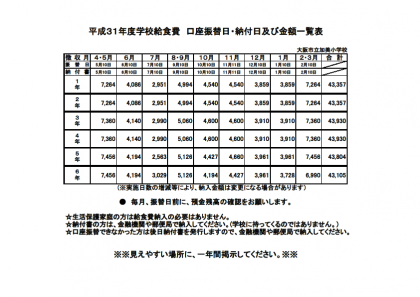 学校給食費の口座振替のお知らせ(年間予定額)の掲載について