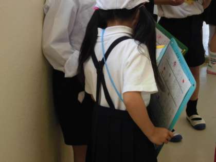 自分たちの持っているワークシートを見ながら、職員室や図書室、国際理解教室などいろいろな教室を説明してもらいました。