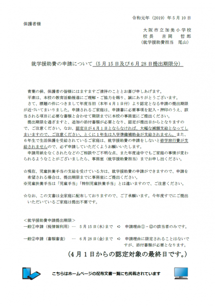 ホームページ右下の配布文書の所に、お子さまを通じて保護者の皆様へ配布しております、就学援助費の申請についての文書を掲載しましたので、ご覧おきください。