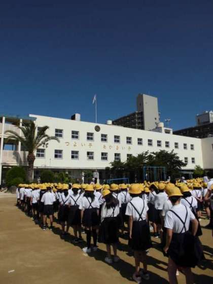 今日の児童朝会は、雲一つない青空の下、運動場で行われました。厳しい日差しなので、運動場で活動する時の帽子着用の大切さについての話がありました。