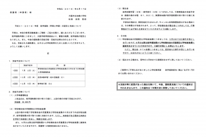 ホームページ右下の配布文書の所に、就学援助(早期2申請)の認定と支給について(早期2申請の認定者のみ)等の文書を掲載しましたので、ご覧おきください。