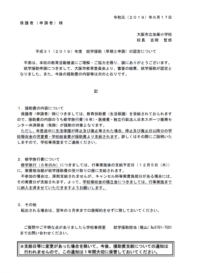 就学援助(早期2申請分)の審査結果が通知されました。早期2申請の認定者には、学校の方から支給等の通知文をお子さまを通じて封筒にて配布しておりますので、ご確認ください。