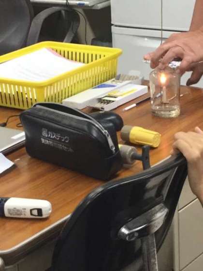 ガラス瓶の中に火のついたろうそくを入れて、ふたをして密封します。