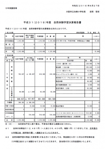この文書は、7月4日〜5日に実施の自然体験学習にかかる費用についての決算報告書となります。お子さまを通じて配布しておりますので、ご確認ください。