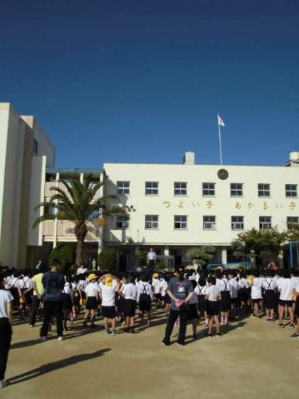 雲一つない青空の下、全校児童が集まり、朝会を行いました。