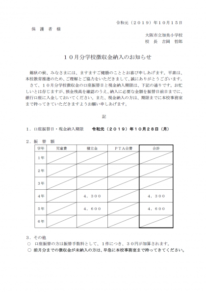 なお、10月分学校徴収金の銀行振替日は、「10月28日(月)」となっておりますので、前日までに学校届出の口座へご入金いただきますよう、お願いいたします。