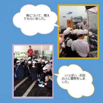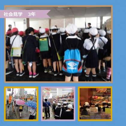 3年生は、雨の中、近くのスーパーマーケットに社会見学に行きました。お店の人に質問をしたり、お店の中を見学したりしました。