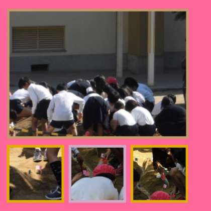 運動場に「流れる水のはたらき」の勉強のために、山と川を作りました。川の外側と内側の水の流れの違いに気を付けて観察しました。