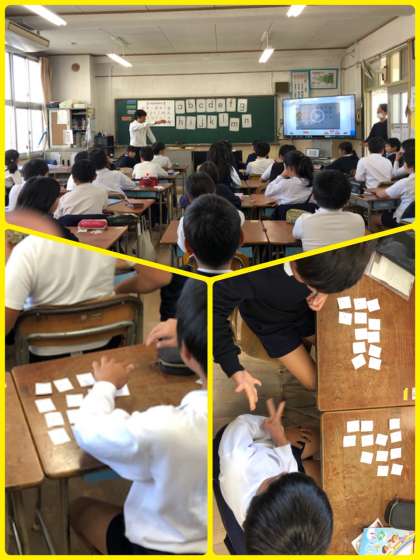 写真下:英語版の神経衰弱ゲームをしました。左側に小文字のアルファベット、右側には大文字のアルファベット。オールイングリッシュの授業です。