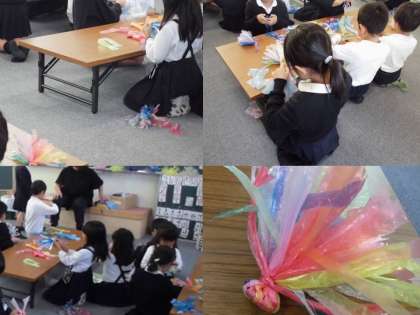 2年生は、国際理解教育としてスズランテープを使って「チェギ」作りをしました。ソンセンニムに作り方を教えてもらいました。