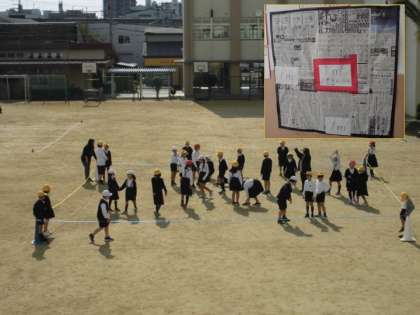 4年生は、算数で面積の学習をしています。実際の面積の大きさを感じるために、運動場で大きな面積の実体験をしました。