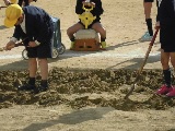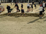 幅跳びをするために、砂場を掘って柔らかくしました。そうじの終わった児童が、いっしょに作業をしました。