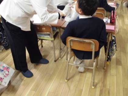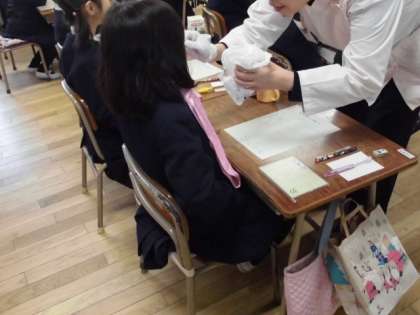 2年生は、午前中にゲストティーチャーをお迎えして、『歯みがき指導』をしました。一人ずつ歯垢染め出し液をぬって、歯の汚れ具合を確認しました。
