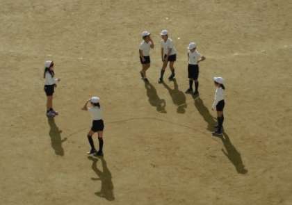 3年生が、授業でグループごとに運動場で「ながなわ」をしている様子です。