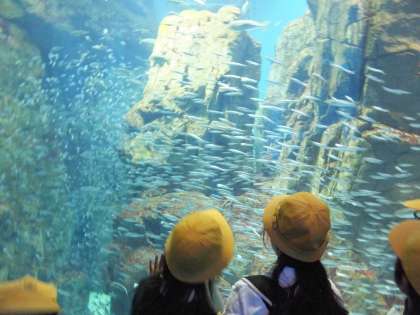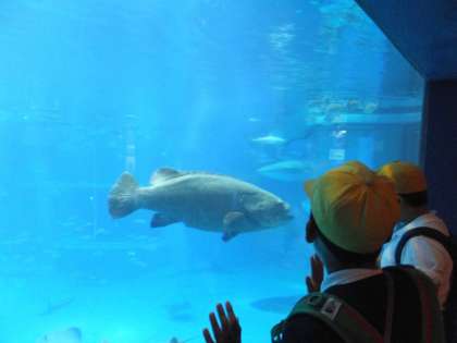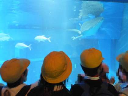 大きな水槽で泳いでいるジンベエザメを見学しました。