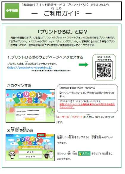 この度、大阪市教育委員会より子どもたちが授業を十分に受けることができないことによって、学習に著しく遅れが生じることがないよう、家庭向けプリント配信サービス「問題データベースプリントひろば」の利用案内がありました。 つきましては、担任より配付しております課題に加えて、必要なご家庭は添付しております「ご利用ガイド」を参考にご活用ください。なお、利用にはユーザーIDとパスワードが必要です。学校までお問い合わせください。