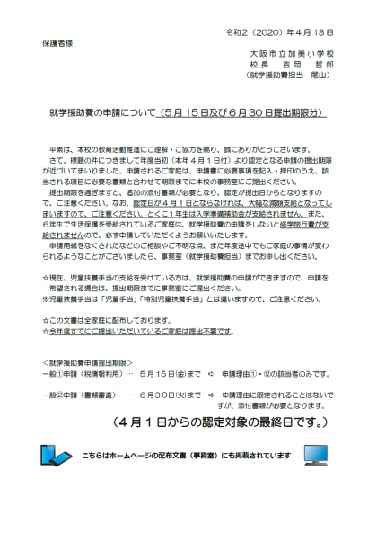 申請を希望される方につきましては、本校より1月24日に配布しております「令和2年度(2020年度)就学援助制度の申請について」の文書と、令和2年度(2020年度)就学援助制度のお知らせのリーフレットの表紙に記載の申請理由、中の書類に記載の収入額の目安の表、また記入例をリーフレットにはさんでおりますので、そちらの書類等を参考の上、記入していただき、お申し込みください。受付期間は以下のとおりです。