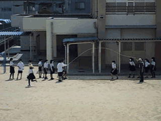 運動場で、長縄をしました。楽しく八の字跳びをしました。