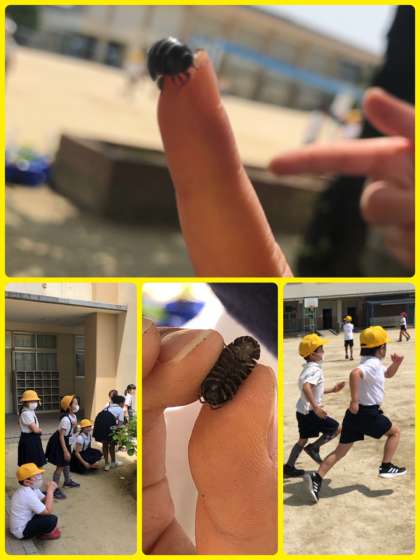 休み時間に、1年生教室の前に座って、運動場を見ていると、次から次へと「ダンゴムシ!」と言いながら、子どもたちが近寄ってきます。