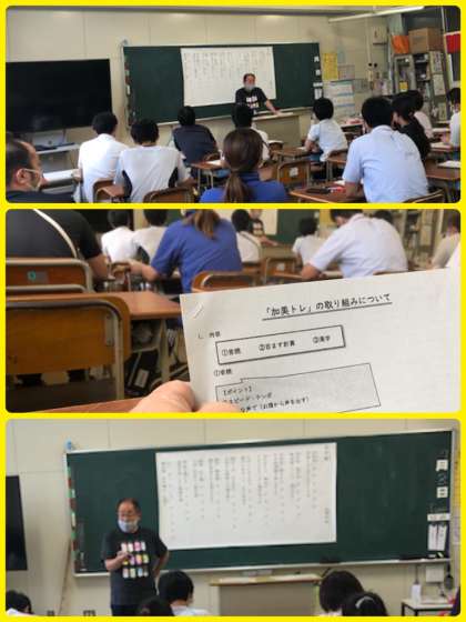 今日は、そのプロジェクトチームのリーダーの先生が、「加美トレの実践」について説明しました。実際に先生たちも、15分間(音読・百ます計算・漢字)のトレーニングに挑戦しました。