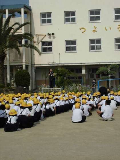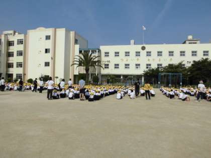 久しぶりに運動場で、児童朝会が行われました。校長先生から「時間を守って行動することの大切さ」についての話がありました。