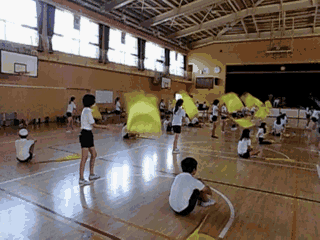 6年生の運動会の練習の様子です。フラッグを使って表現します。