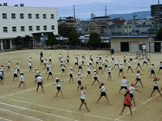 運動場で練習をしています。体育館から移動してきているので、自分の場所を確認した後、踊っています。