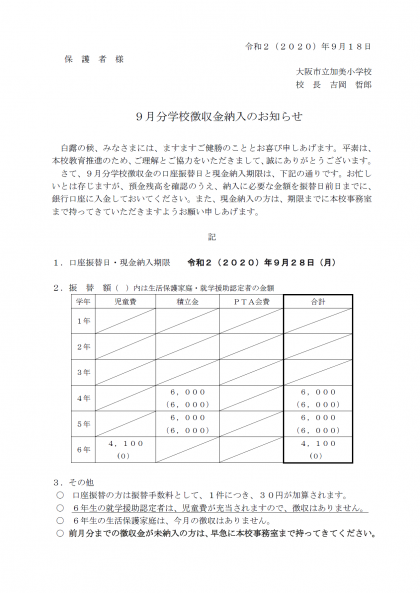 「9月分学校徴収金納入のお知らせ」の掲載について