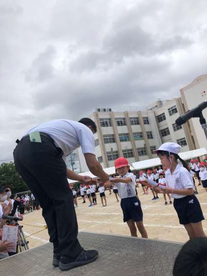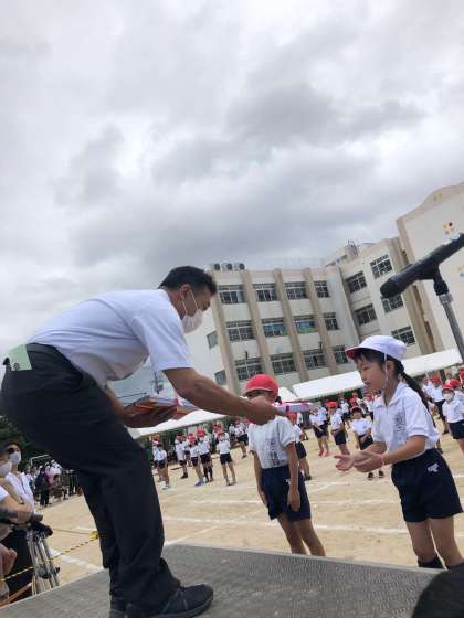 運動会 参加賞授与 PTA会長 菊川様より